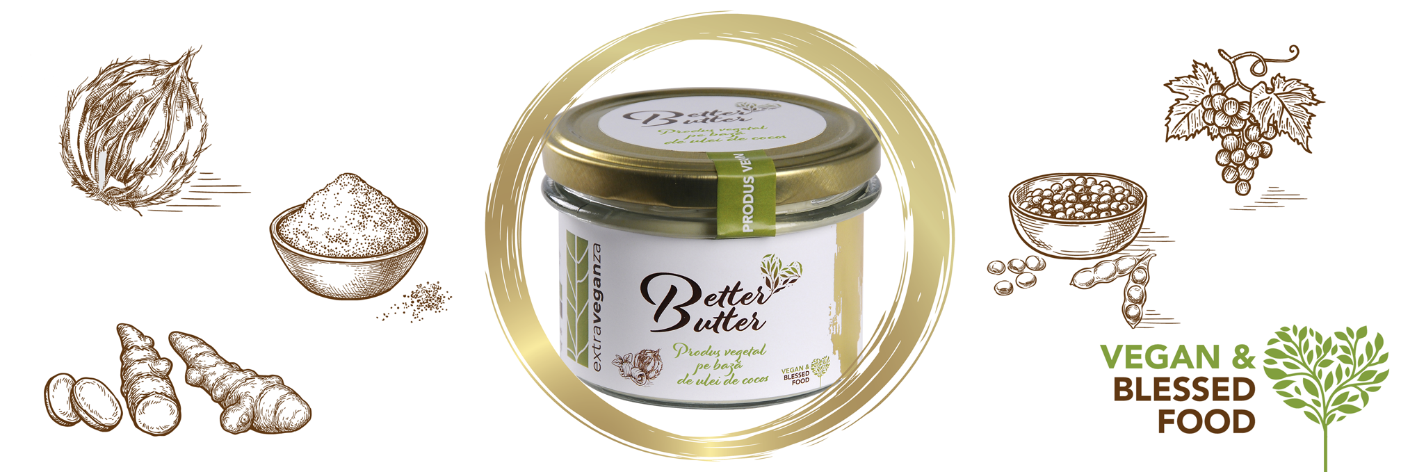 BETTER BUTTER este cu adevarat sănătos. Printre ingredientele sale se numără uleiul de cocos (singura grăsime care conține lanțuri de trigliceride scurte și medii și nu necesită enzime pancreatice sau biliare pentru digestie, fiind transformat direct în energie de către ficat), turmeric (folosit pentru culoare, dar și pentru proprietățile sale benefice) și ulei de sâmburi de struguri.